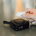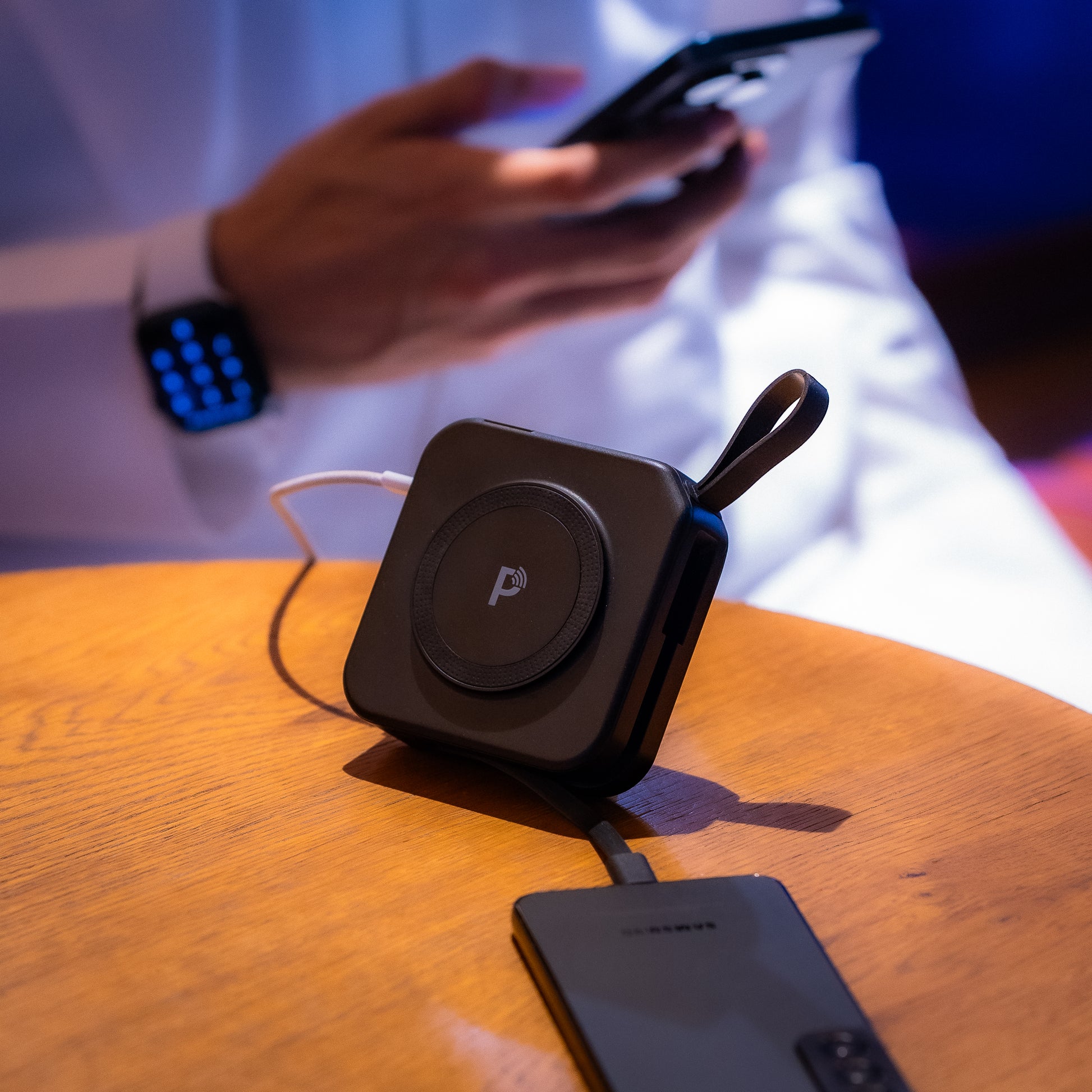PowerPro Universal tiene cables incorporados de Lightning & USB-C que admiten una carga rápida. No más cables desordenados y enredados y nunca te preocupes por dejarlos atrás.